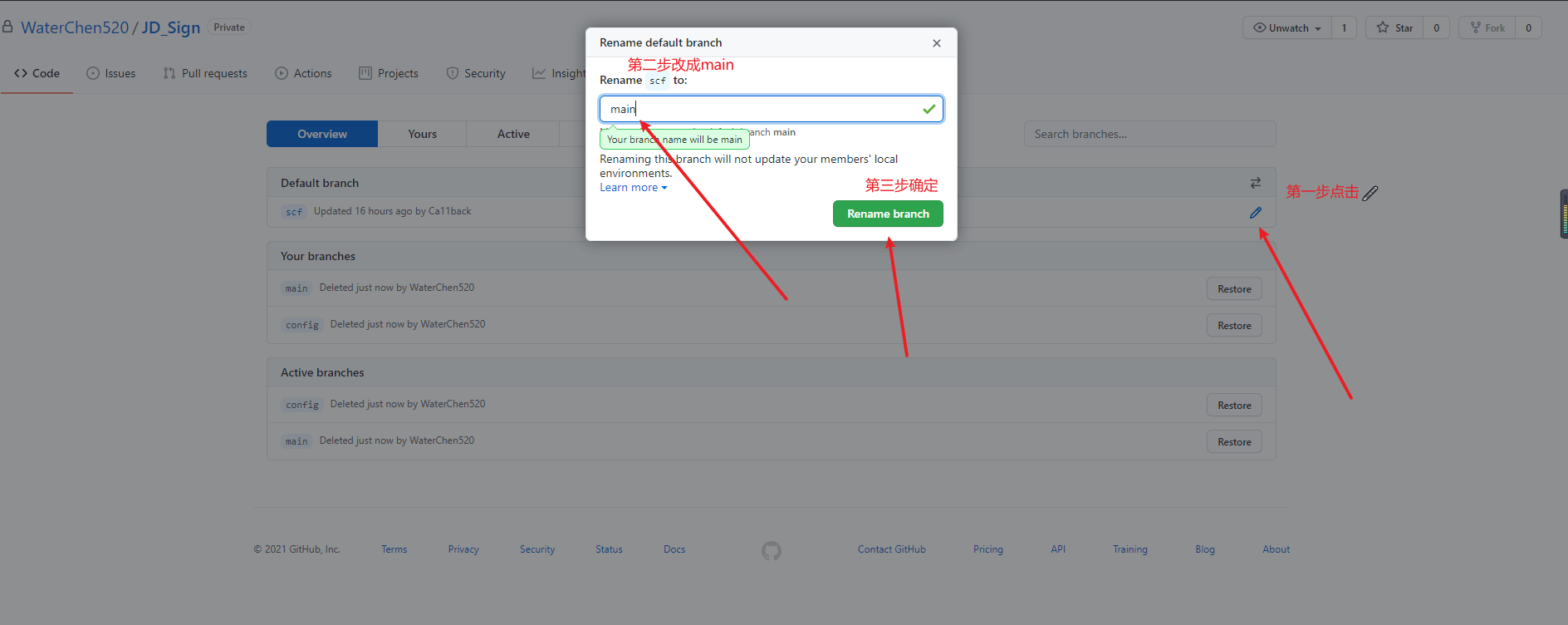7. 点击刚才页面’scf’分支右侧笔图标,将其重命名为’main’