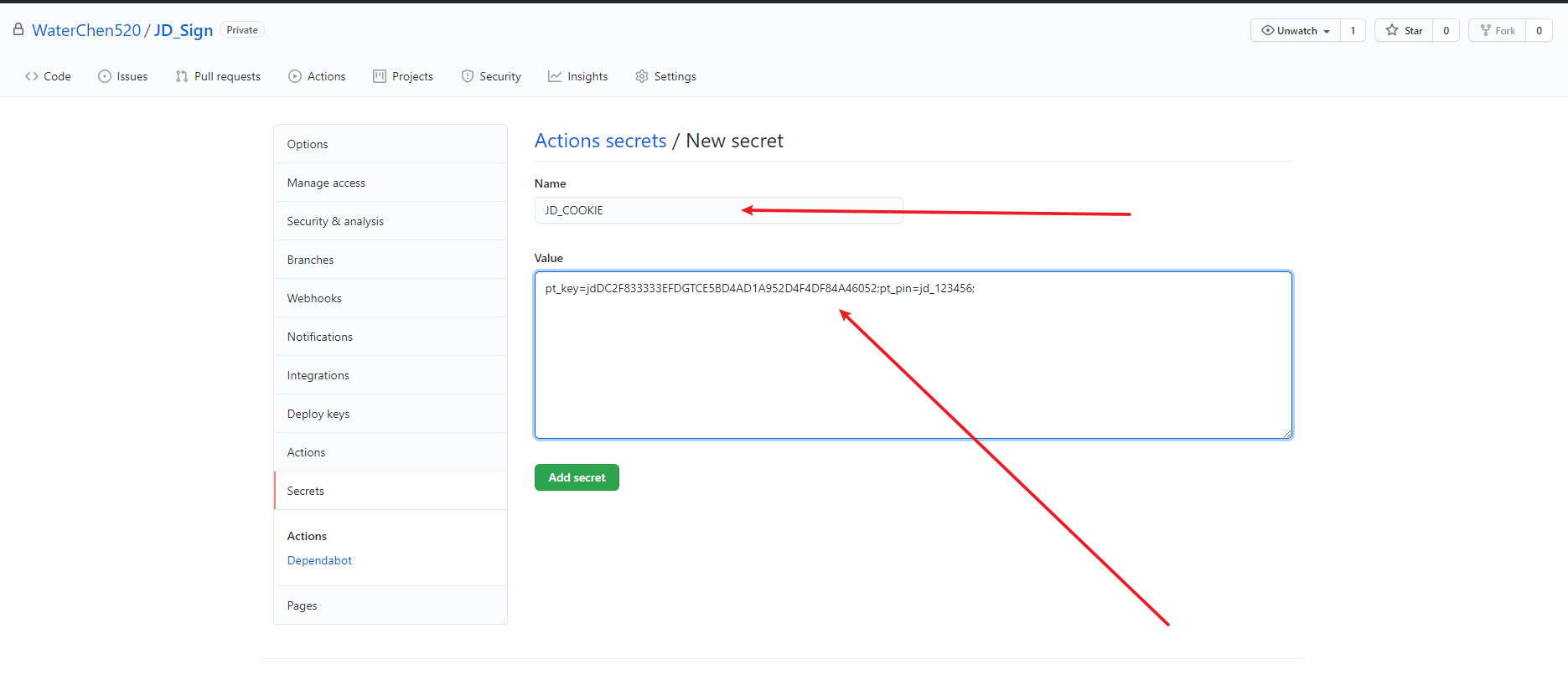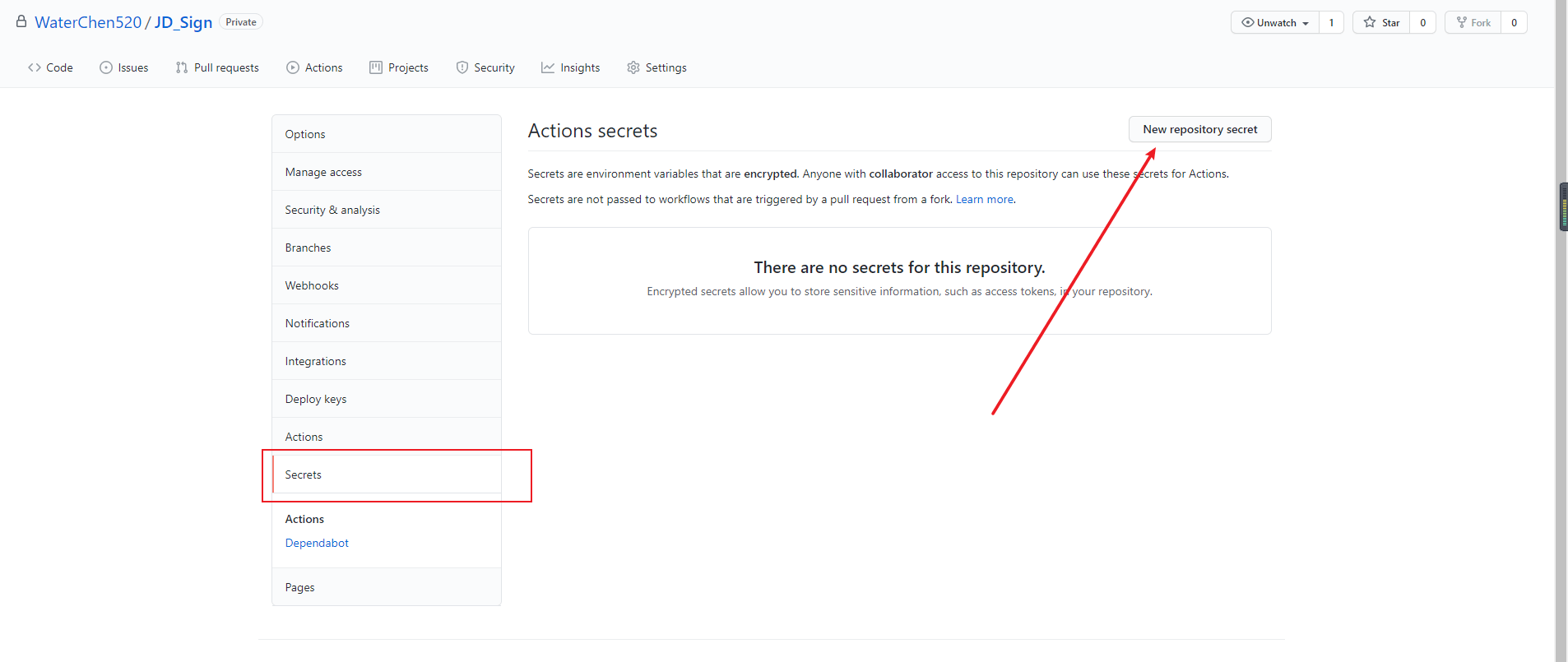 secrets 变量位置 : Settings–左边栏的Secrets–右上角New repository secret–Name填变量名称,Value填变量值