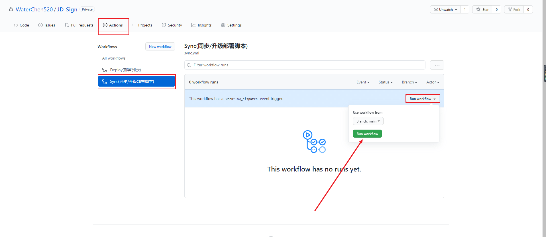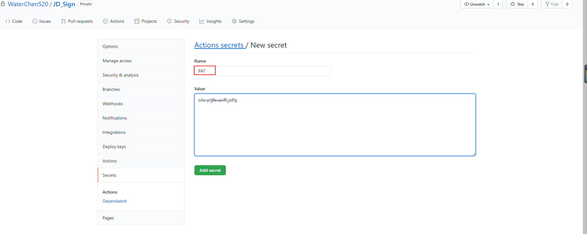 Settings-Secrets-New secretname填PAT,Value填入上方申请到的 PAT,保存即可手动触发一次代码同步点击