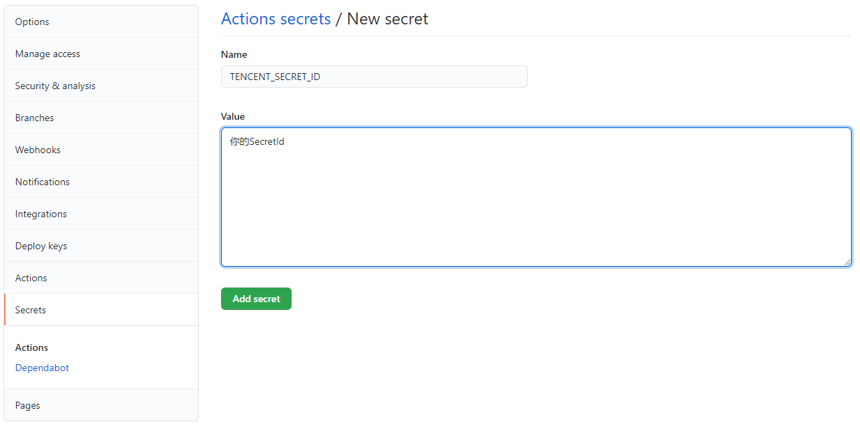 将 SecretId 和 SecretKey 分别配置在仓库的 secrets 变量里面