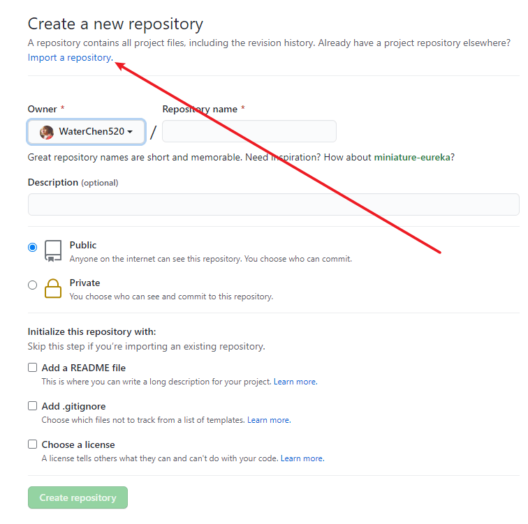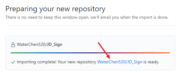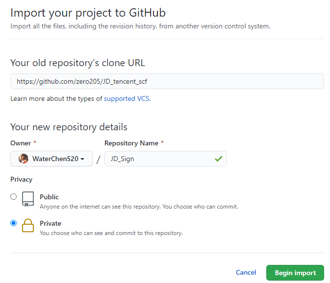 Repository name 仓库名字随便起名,将仓库改为私有,然后点击 Begin import,完成导入