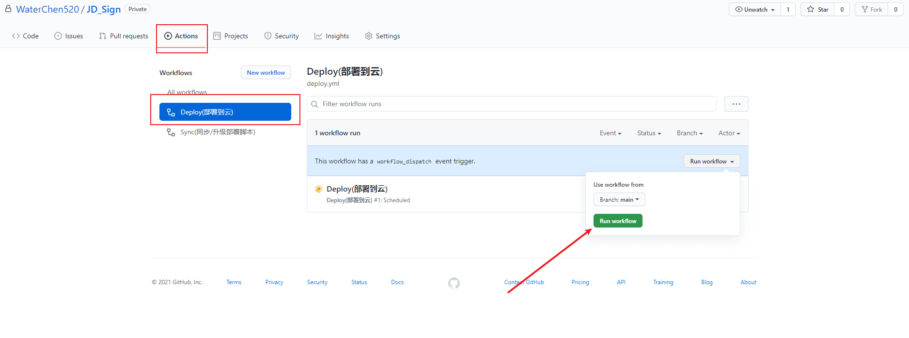Actions,执行Run Workflows等待两分钟左右,能够发现代码全部同步过来