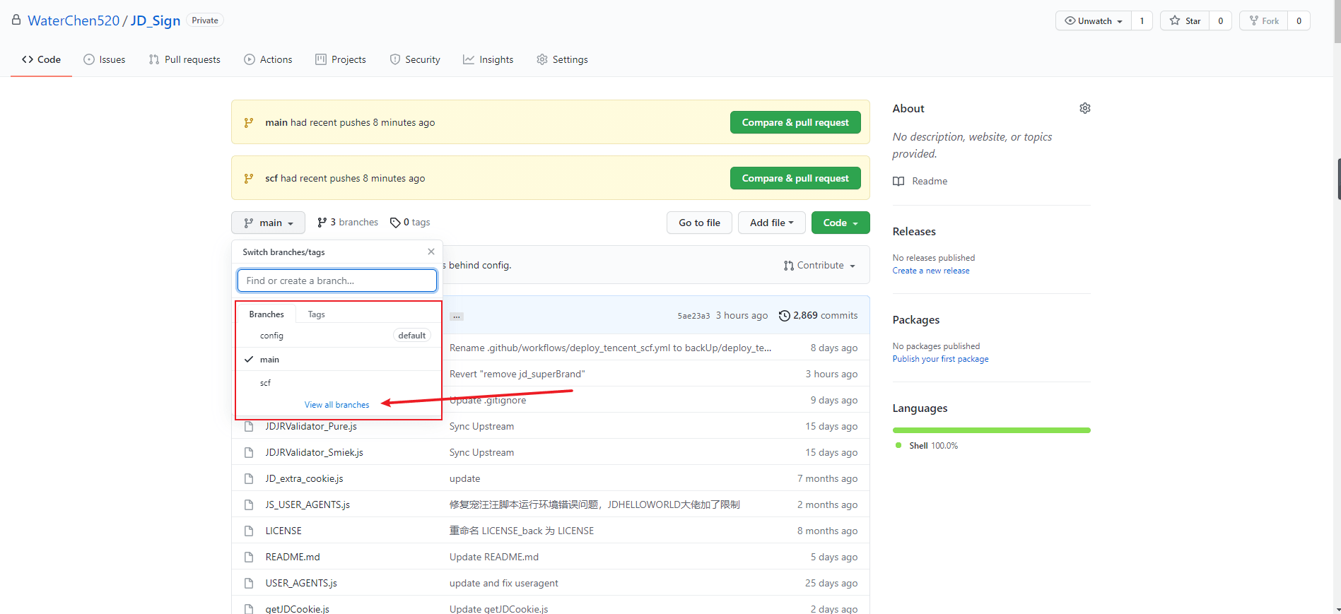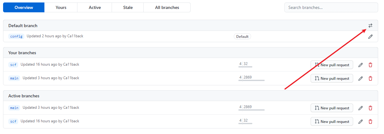 - 将分支切换为 main 分支后,在下拉菜单中点击最下方’view all branches’,点击’Default branch’最右侧箭头,然后在新页面继续点击箭头,再弹出框中选择’scf’为主分支